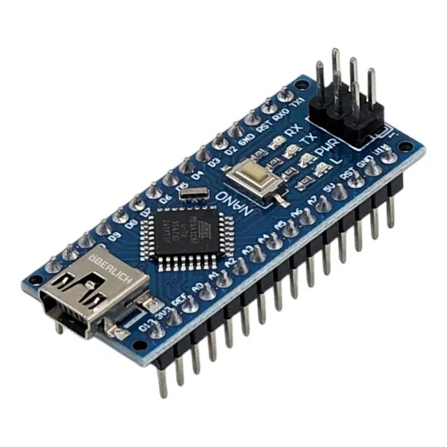 Imagen tomada como referencia, la verdad no se si actualmente se vea así, pero en si no cambiado tanto, de unos años para acá, las primeras si estaban mas rusticas por así decirlo, yo la tengo a la mano es una Arduino Nano. En esta imagen se puede ver las partes principales del Arduino y entre ellas el microcontrolador ATmega328, un integrado que tiene varios periféricos incluidos en un solo chip. este es de montaje “through hole” (THT) o de pines pues, el que tengo que es de una tarjeta Nano tiene el mismo microcontrolador (bueno casi el mismo , tienen el mismo nombre) pero de montaje superficial o SMD.